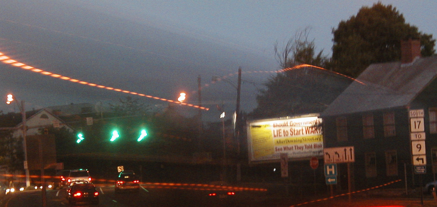 Local Peace Groups Place Billboard in Middletown For release 9/13/2005 West Hartford Citizens for Peace and Justice, the Connecticut Coalition for Peace and Justice and the Middletown Alliance for Peace have erected a "Billboard for Truth" at the Middletown, Connecticut end of the Arrigoni Bridge. It will remain there for one month. The Billboard asks the question, "Should Governments Lie to Start War?" and displays excerpts from the "Downing Street Memo," the British government summary of a meeting between US and British diplomats in July 23, 2002, three months before the drumbeat to war began and eight months before the invasion of Iraq. This top-secret memo, leaked to the London Times, details the weakness of the case for invasion, and President Bush’s intent to invade Iraq regardless of the evidence and to "fix" intelligence and "facts" around this "policy." A central component of the billboard is the web site www.afterdowningstreet.org which provides the full text of this and other British intelligence memos regarding the plans for war. The intent of the billboard project is to more widely disseminate information about what many people believe was an illegal conspiracy to lie to Congress, to the American people and to the world. While the American public finds it hard to accept that their government would coldly and knowingly lie to them about such an important matters as the need to go to war, these documents give us a glimpse into the untruths that were planned to lead the people of the United States into an unjustifiable war. Many people ask: "Why do so many people of the world distrust our Government?" One of the answers is that they see and discuss important documents, such as these, about our government’s manipulation of the facts and are shocked. Even more shocking is the fact that we here in the United States know virtually nothing about these documents. . Location: If you cross the Arrigoni Bridge from Portland to Middletown, as you approach Main Street and the traffic circle it is in front of you on the right as you look down Main Street. [In the picture below: the Billboard is shown; Main Street is straight ahead; the cars are about to go past the traffic circle and the Arrigoni Bridge is behind to the left]