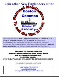 New England Mobilization to End the War Bring All The Troops Home, Now! The vast majority of the people in every corner of the country want this war to end, but Washington has failed to take decisive action. With each passing month, nearly 4000 military people and tens of thousands Iraqis are killed, some 12 billion of our tax dollars are spent, and the death and destruction continue. Our communities -- from New Orleans to Minneapolis – are neglected and suffer the consequences. From Vermont to California, from Florida to Wisconsin, the people have spoken: We want this war to end, and we want it to end now! On Saturday, October 27th, people from all walks of life will gather in 10 sites around the country for massive regional demonstrations. This nationally coordinated day of outcry against the war in Iraq was initiated by United for Peace and Justice, the nation’s largest grassroots antiwar coalition. And now many groups and organizations across the country are working on the October 27th mobilization. You are invited to join this effort! What we do now will help shape our future. We the People must end this war!
